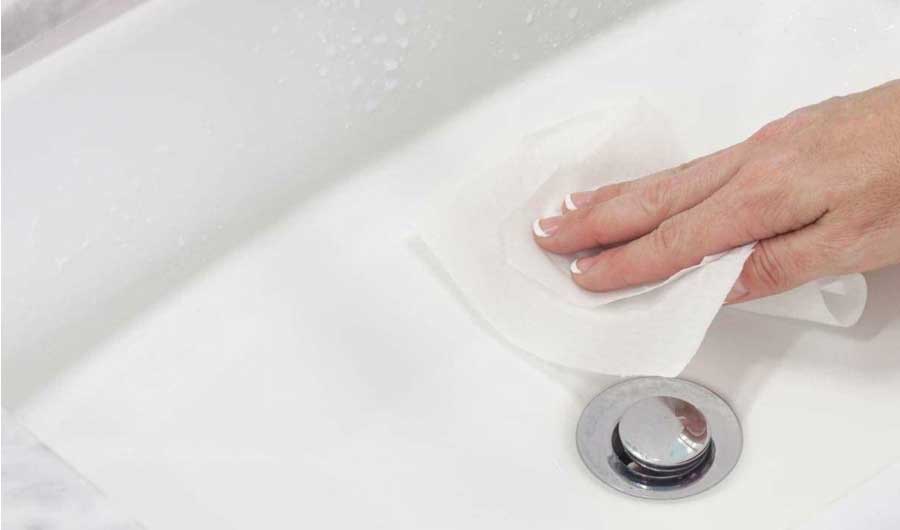 Για να κάνετε τον καθαρισμό ευκολότερο, τοποθετήστε απολυμαντικά μαντήλια κοντά στο νιπτήρα. Το γρήγορο σκούπισμα του νεροχύτη και της βρύσης αφού πλύνετε τα χέρια σας ή βουρτσίσετε τα δόντια σας, θα αφήσει το μπάνιο σας με αυτή τη φρεσκοκαθαρισμένη αίσθηση. Αυτό αποτρέπει τόσο τη βρωμιά όσο και τους λεκέδες από νερό.